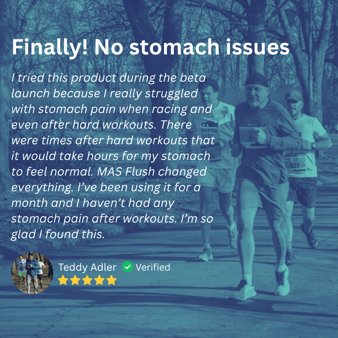 I tried this product during the beta launch because I really struggled with stomach pain when racing and even after hard workouts. There were times after hard workouts that it would take hours for my stomach to feel normal. MAS Flush changed everything. I’ve been using it for a month and I haven’t had any stomach pain after workouts. I’m so glad I found this.